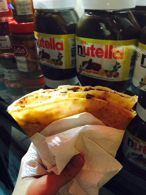 4. Slide the crepe onto a plate and spread with Nutella. Fold the crepe in half, then fold in half again to form a triangle. Yummy!